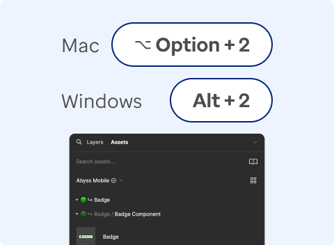 When you are in the design file, you can access Abyss components through the Assets panel. The Assets panel is where you can find all of the Abyss Components. You can drag any Component from the Assets panel into the canvas to create an Instance. To open the Assets panel, click on the Assets heading in the Layers panel.